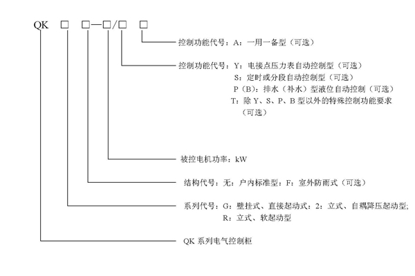 QK系列電氣控制柜共分三類,其中,QKG系列電氣控制柜,控制功率從3 kW~15 kW,為壁掛式、直接起動型水泵控制;QK2系列電氣控制柜,控制功率從18.5kW~220 kW,為立式、自耦降壓起動型水泵控制柜;QK系列電氣控制柜都具有主回路短路、缺相、三相不平衡、過載等保護功能。同時,增加了電流表、電壓表指示功能,便于觀察判斷。