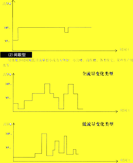 Q需=M×C 式中:M:為戶數(shù)(每戶按一個(gè)Dg15水嘴取水量1立方米/小時(shí)考慮). C:為集中開(kāi)戶率,對(duì)于生活用水可在12%-20%之間選擇. 每戶按原定計(jì)劃人考慮。若系統(tǒng)中有其它較大集中用戶水,如賓館、學(xué)校一般集中開(kāi)戶率較大,應(yīng)按實(shí)際情況分別計(jì)算相加. B、供水高度H需: H需指貯水池(箱)底到系統(tǒng)內(nèi)最高建筑物的垂直高度(見(jiàn)參數(shù)表),采用地下水池作為水源,從設(shè)備地面計(jì)算的高度要加上吸程(3-5米). C、流量變化類型: |
